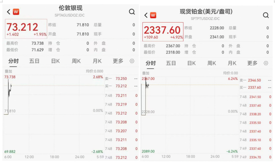 现货黄金逼近4500美元/盎司,现货白银跳空高开,突破73美元/盎司,再创历史新高,年内涨幅已超150%。现货铂金日内近5%,截至7:48,报2337.6美元/盎司。