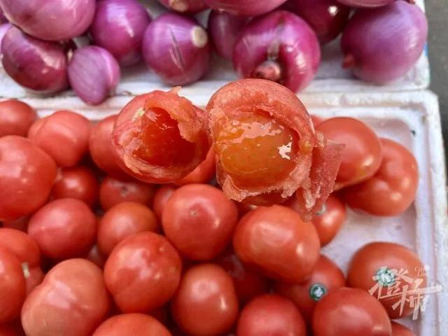 记者看到,好几家卖番茄的摊主,都特意掰开了一个番茄,水灵灵地放在摊位上,用颜值吸引顾客。