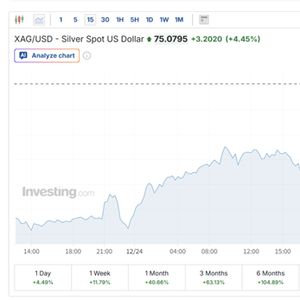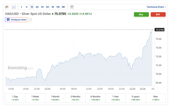 财联社12月26日讯(编辑 卞纯)周五亚市早盘,现货连破三道关口,一举突破75美元/盎司,再创历史新高,现报75.08美元/盎司,日内上涨4.45%,为连续第五个交易日上涨。