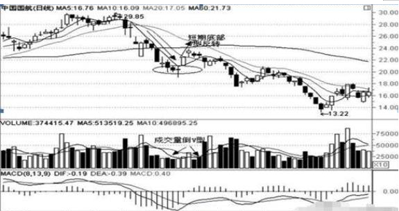 短期底部的价量特征是:股价经过一段不长时间的连续下跌之后,因导致短期技术指标超卖,从而出现股价反弹的转折点。短期底部以V形居多,而成交量以反V形居多,发生行情转折的当天经常在日K线图上走出较为明显的下影线,在探到底部之前,常常会出现几根比较大的阴线,也就是说,每一次加速下跌都会探及一个短期底部。短期底部之后,将是一个历时很短的反弹,这一反弹的时间跨度多则三五天或一周左右,少则只有一天,反弹的高度在多数情况下很难超过加速下跌开始时的起点。在反弹行情中,以低价位的三线股表现最好,而一线优质股则波幅不大。