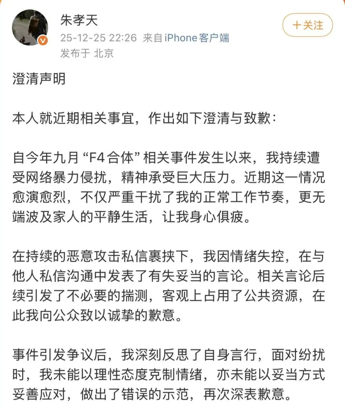12月25日晚,朱孝天发布“澄清声明”,回应此前与“F4合体”相关事件。声明中称:在持续的恶意攻击私信裹挟下,我因情绪失控,在与他人私信沟通中发表了有失妥当的言论。