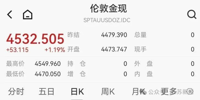 现货黄金报4532.505美元/盎司,单日涨1.19%,本周累涨4.41%。