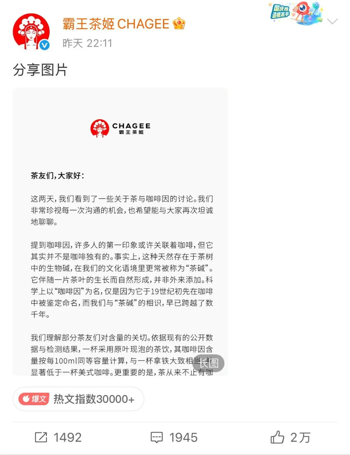 面对汹涌舆情和资本市场反应,霸王茶姬紧急发布声明,试图平息这场突如其来的危机。该公司解释其产品的咖啡因含量:“一杯采用原叶现泡的茶饮,其咖啡因含量按每100毫升同等容量计算,与一杯拿铁大致相当,并显著低于一杯美式咖啡。”