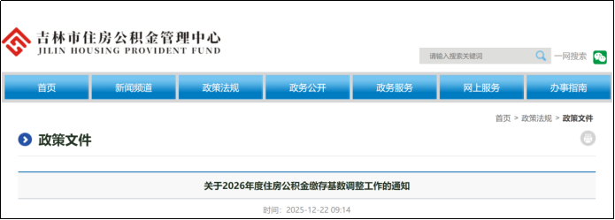 12月22日,吉林市住房公积金管理中心发布《关于2026年度住房公积金缴存基数调整工作的通知》,明确自2026年1月1日起,统一按新核定的缴存基数执行缴存。