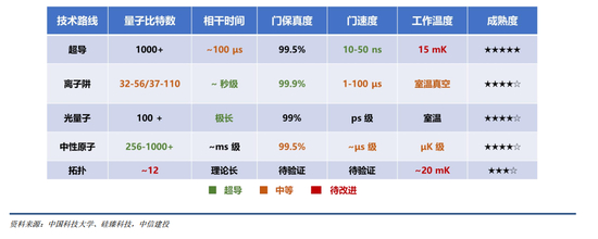 从主流技术路线来看,超导、离子阱、中性原子、光量子、半导体量子以及拓扑量子等多元技术路径齐头并进。其中,超导、离子阱和中性原子是当前实现通用量子计算的三大主流技术路径,光量子技术进展相对缓慢,半导体路线在扩展性等方面存在瓶颈,其他技术路线仍然处在实验室阶段。各技术路线的核心差异点在于物理载体(电路/离子/光子)、操控指标(微波/光频/静电)、环境需求(低温/真空/磁场)及扩展瓶颈(退相干/串扰/光子损耗)等,且各技术路线均需要满足以下标准:
