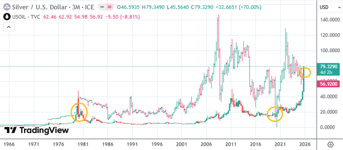 这意味着,一盎司白银的价格已超过一桶美国原油——上一次出现这一情形还是在2020年4月份,当时新冠疫情爆发重创能源价格,但之后油价很快收复了跌幅;再早的纪录则要追溯到1980年。