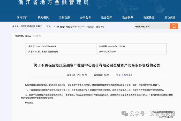 2024年10月:浙江证监局对俞发祥作出行政处罚,查明其指使祥源文旅虚构资产收购套取4.1亿元资金,用于旗下地产项目;同月,浙江省地方金融管理局公告,取消浙金中心金融资产交易业务资质,仅保留存量业务处理权限。(此时浙金中心已无合规交易资质,且祥源系资金问题已被监管盯上)