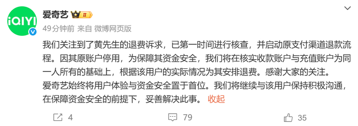 每经AI快讯,12月28日,爱奇艺发文称,关注到了黄先生的退费诉求,已第一时间进行核查,并启动原支付渠道退款流程。因其原账户停用,为保障其资金安全,我们将在核实收款账户与充值账户为同一人所有的基础上,根据该用户的实际情况为其安排退费。感谢大家的关注。爱奇艺始终将用户体验与资金安全置于首位。我们将继续与该用户保持积极沟通,在保障资金安全的前提下,妥善解决此事。12月28日,话题“男子爱奇艺会员充了25年遇退费难”登上微博热搜。据报道,12月25日,河南许昌,黄先生称爱奇艺会员充了25年,现在想退费却遇到了难题。