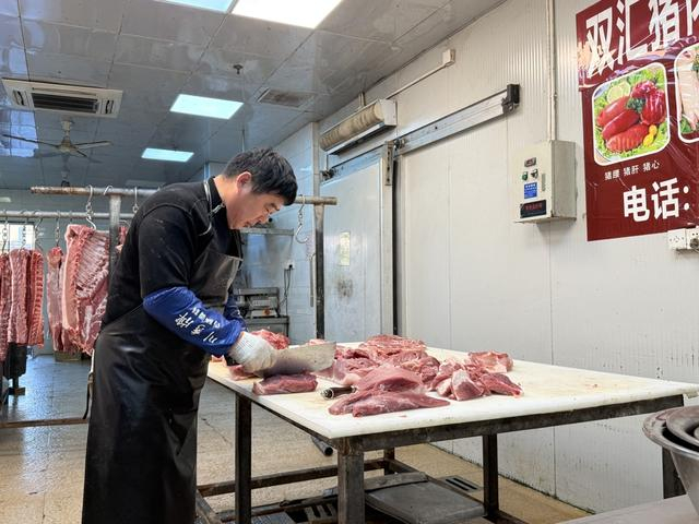 “现在店里每天能卖出五六十头猪,换算成猪肉大约1万斤。”上海聚鑫徕食品销售有限公司负责人王成义告诉记者,企业主要向食堂、饭店及企事业单位供货,为了方便周边居民,王成义的店铺白天也兼营零售业务。记者在现场看到,店内零售的价目表显示,腿肉9.5元/斤、肋排24元/斤,不少市民会“组团”来采购。