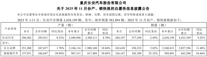 最新数据显示,2025年1至11月,长安汽车累计销量为265.82万辆,同比增长9.25%。其中自主品牌累计销量为226.04万辆,同比增长11.48%;新能源汽车销量为99.49万辆,同比增长54.66%。海外市场方面,长安汽车累计销量为58.39万辆。按计划,2025年长安汽车年销目标为300万辆,其中新能源汽车销量目标为100万辆,海外销量目标为100万辆。