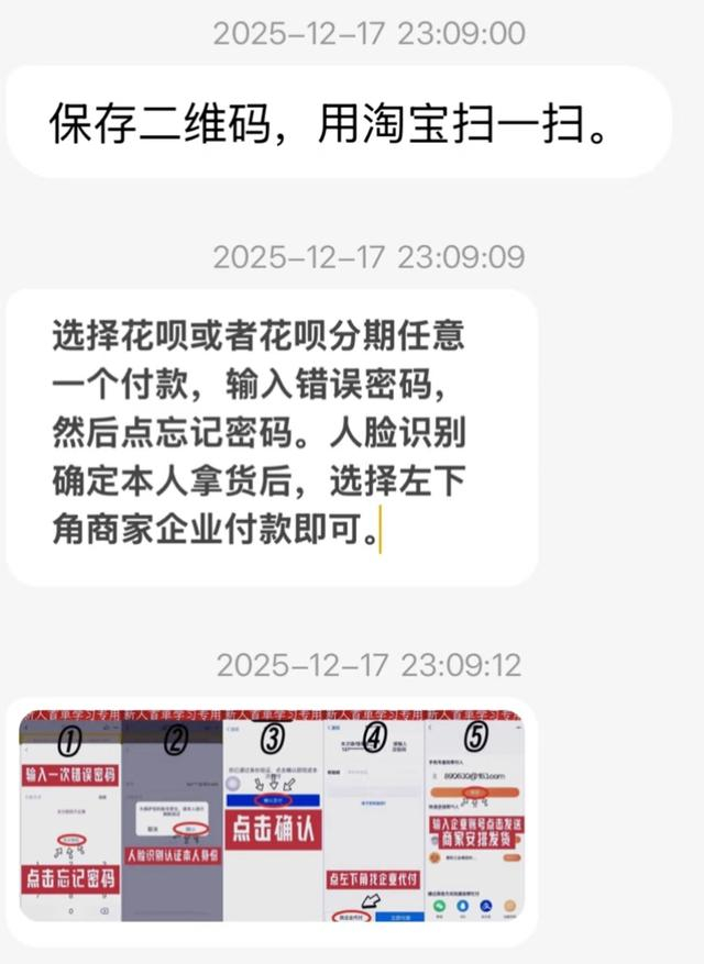 由于该管理员话术非常熟练,刘先生没有多想,就申请加入了这个据称用于“统计信息”的QQ群,并与客服确认了收货信息。此时他收到了下一个“作业”:长达38秒的“领取教程”。这一教程并非告知“测评官”如何写产品测评,而是引导大家用淘宝扫码跳转支付宝,并先“输错一次密码”,选择“忘记密码”后开启人脸识别验证身份,再提交“代付申请”并选择“找企业代付”这一选项,客服称通过这种方式可以“零元购”,由他们“企业”付费为“测评官”购买产品。
