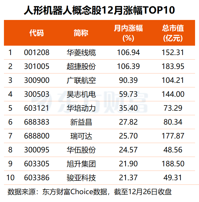 市场表现方面,12月以来,近七成人形机器人概念股股价上涨,其中,叠加商业航天概念的华菱线缆超捷股份的股价均涨超一倍,广联航空亦大涨九成,昊志机电华培动力分别上涨59.73%和35.40%。