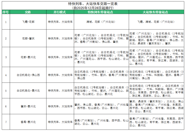 此次运行图调整主要是增加“白云机场北-惠州北”特快列车、大站快车交路,新增竹料站为特快列车、大站快车停靠点;站站停交路“飞霞-竹料”调整为“飞霞-花都”“花都-竹料”,广清城际铁路沿线的旅客若需前往其他城际线路可通过花都站进行换乘。