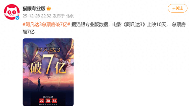 【环球网互娱综合报道】12月29日消息,据猫眼专业版数据,科幻电影《阿凡达 3》上映10天,总票房破7亿。