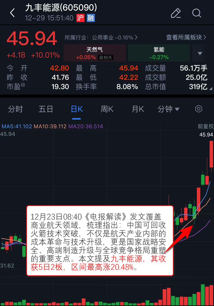 12月23日08:40《电报解读》发文覆盖商业航天领域,梳理指出:中国可回收火箭技术突破,不仅是航天产业内部的成本革命与技术升级,更是国家战略安全、高端制造升级与全球竞争格局重塑的重要支点。本文提及九丰能源。