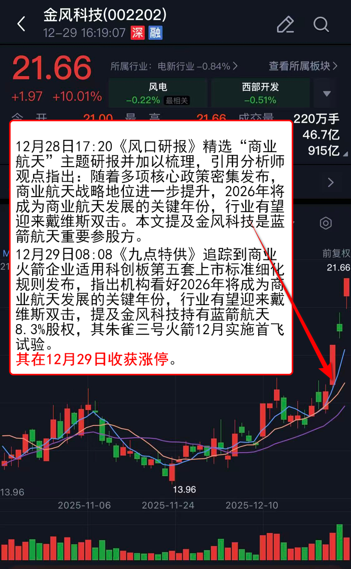 12月28日17:20《风口研报》精选“商业航天”主题研报并加以梳理,引用分析师观点指出:随着多项核心政策密集发布,商业航天战略地位进一步提升,2026年将成为商业航天发展的关键年份,行业有望迎来戴维斯双击。本文提及金风科技是蓝箭航天重要参股方。
