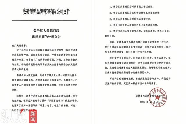 12月28日,安徽墨鸭品牌管理有限公司在官方账号发布了“关于江大墨鸭门店违规问题的处理公告”,公告中称,12月25日,该司旗下镇江江苏大学墨鸭门店与消费者发生言语冲突,在学府路派出所的调解下,总部及江大门店负责人已向当事同学当面致歉并作出赔偿,得到了当事同学的谅解。总部也责令该门店作出辞退涉事员工、停业整顿、门店负责人在网络上道歉等处理。