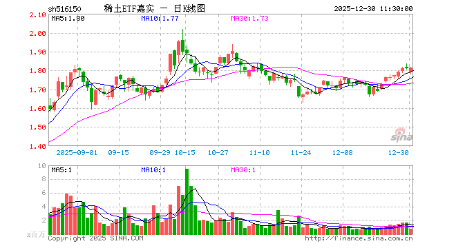 12月30日,截止午间收盘,稀土ETF嘉实(516150)涨0.33%,报1.815元,成交额1.30亿元。稀土ETF嘉实(516150)重仓股方面,北方稀土截止午盘涨0.33%,卧龙电驱涨1.38%,领益智造跌0.32%,中国稀土跌0.39%,盛和资源涨0.79%,格林美涨2.00%,金风科技跌4.80%,包钢股份涨0.00%,厦门钨业涨1.70%,中国铝业涨5.07%。
