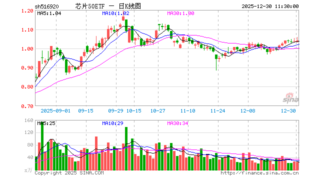12月30日,截止午间收盘,芯片50ETF(516920)涨0.39%,报1.040元,成交额2677.19万元。芯片50ETF(516920)重仓股方面,中芯国际截止午盘涨1.49%,寒武纪涨2.83%,海光信息涨1.56%,北方华创涨0.76%,澜起科技跌0.02%,兆易创新跌3.02%,豪威集团跌0.09%,芯原股份涨3.55%,长电科技涨0.74%。