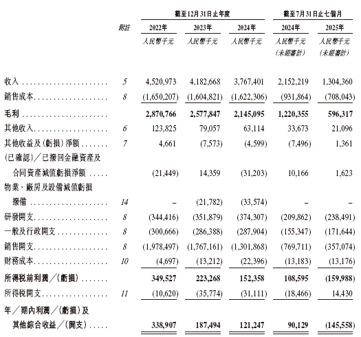 招股书显示,在过去的2022年、2023年、2024年和2025年前七个月,悦康药业的营业收入分别为人民币45.21亿、41.83亿、37.67亿和13.04亿元,相应的净利润分别为3.39亿、1.87亿、1.21亿和-1.46亿元。