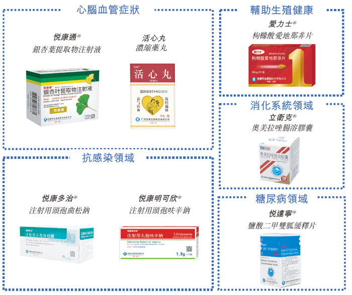 于往绩记录期间,悦康药业多款旗舰产品凭借良好的市场接受度为公司带来收入及现金流,包括:悦康通®(银杏叶提取物注射液)在中国的医院覆盖面广泛,包括三级及二级医院,用于管理脑血管和外周血管障碍。爱力士®(枸橼酸爱地那非片)在中国的泌尿科和男科环境中用于处方,治疗男性勃起功能障碍。立卫克®(奥美拉唑肠溶胶囊)、悦达宁®(盐酸二甲双胍缓释片)等其他关键产品进一步扩大了公司在主要治疗领域的覆盖面。悦康药业也销售具有广泛标示适应症的头孢菌素抗生素。