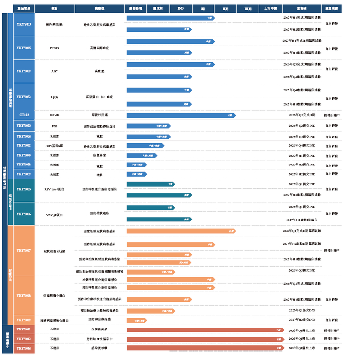 寡核苷酸方面,公司正在推进长期作用、靶向肝脏的项目,旨在通过减少大规模慢性疾病指示中的给药频率来支持持续的药理学。关键项目包括YKYY013,一种针对慢性乙型肝炎的靶向肝脏的小干扰核糖核酸(siRNA)项目,旨在减少肝细胞中的病毒转录物;YKYY015,一种针对PCSK9的心血管代谢siRNA项目,针对临床验证的LDL-C降低途径;以及YKYY029,一种针对高血压的肾素- 血管紧张素系统的上游调节的肾素原(AGT) siRNA项目,旨在实现持续的血压控制。这些项目均已进入中国的临床开发,并获得美国监管机构的临床试验批准。