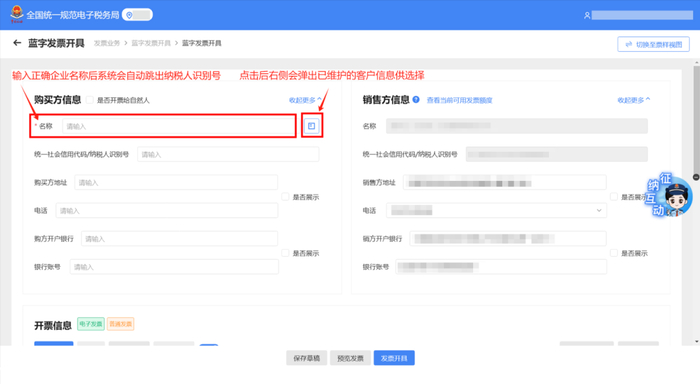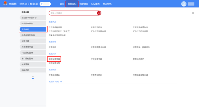 打开“全国统一规范电子税务局”网页,选择企业业务进行登录,登录成功后,进入首页,点击我要办税→发票使用→蓝字发票开具,进入蓝字发票开具页面,点击发票填开模块立即开票→选择发票类型普通发票→确认。进入蓝字发票开具→填入购买方信息、货物或应税劳务方式,信息确认无误后点击发票开具即可完成发票开具。