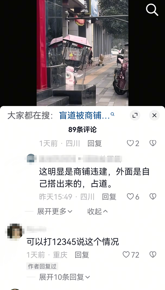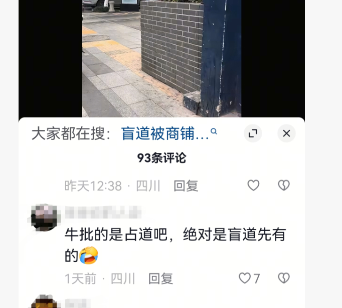 网友对此留言,“这明显是商铺违建,外面是自己搭出来的,占道”,还有网友说“牛的是占道,绝对是盲道先有的”。