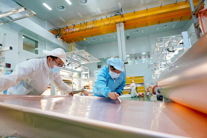 2024年10月10日,位于青海西宁东川工业园区的青海诺德新材料有限公司,工作人员在对铜箔表面质量抽检。该公司通过持续创新,多项技术指标成为锂电铜箔行业的质量标准,自主研发的3微米极薄锂电铜箔获得量产突破,处于行业领先水平。