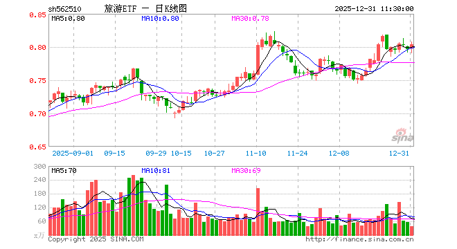 12月31日,截止午间收盘,旅游ETF(562510)涨1.01%,报0.804元,成交额3112.90万元。旅游ETF(562510)重仓股方面,中国中免截止午盘涨1.24%,上海机场跌1.01%,中国东航涨4.06%,宋城演艺跌0.12%,南方航空涨2.09%,中国国航涨2.32%,华侨城A涨0.00%,锦江酒店涨2.63%,春秋航空涨0.50%,首旅酒店涨3.42%。