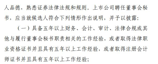 例如,《上海证券交易所股票上市规则》对上市公司董秘的基础要求是:“应当具备履行职责所必需的财务、管理、法律等专业知识,具有良好的职业道德和个人品质。”