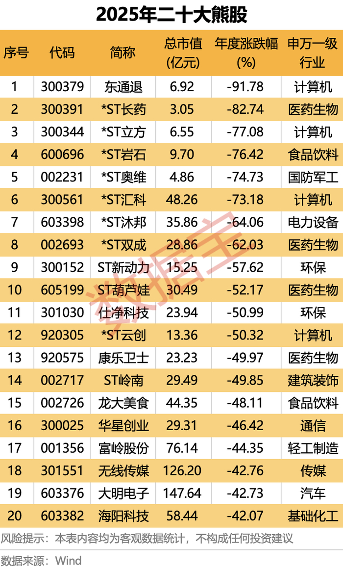 熊股方面,2025年,共计25股年度跌幅超过40%。在非退市股、非ST个股中,仕净科技跌幅居首,年度跌幅达到50.99%;康乐卫士、龙大美食、华星创业紧随其后,全年跌幅均超过45%。