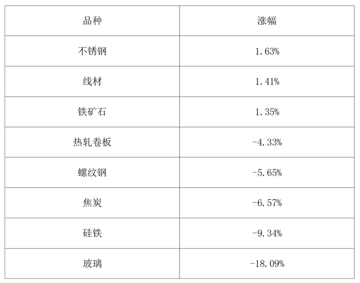 2025年黑色建材板块整体“躺平”,呈现“弱需求主导、成本支撑有限、震荡磨底”的特征,全年价格重心下移,品种表现显著分化。其中,不锈钢、线材、铁矿石涨幅居前,玻璃、硅铁、焦炭等跌幅靠前。
