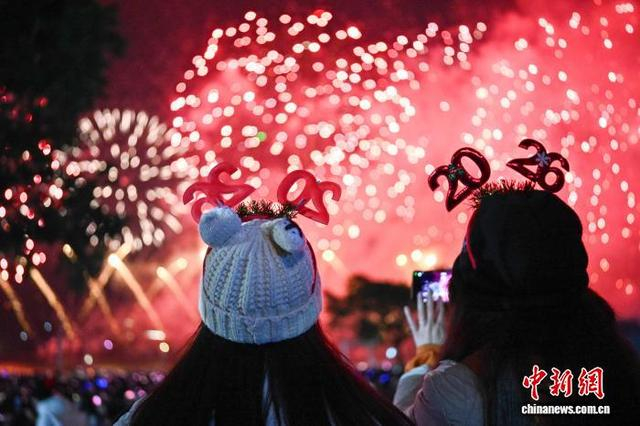 2026年1月1日,民众在重庆长寿湖畔观看烟花秀。2025年12月31日晚,数万名观众齐聚重庆长寿湖畔的重庆天空剧院,沉浸式体验“焰遇重庆·跨年烟花许愿夜”,在璀璨烟火中迎接新年的到来。中新社记者 何蓬磊 摄