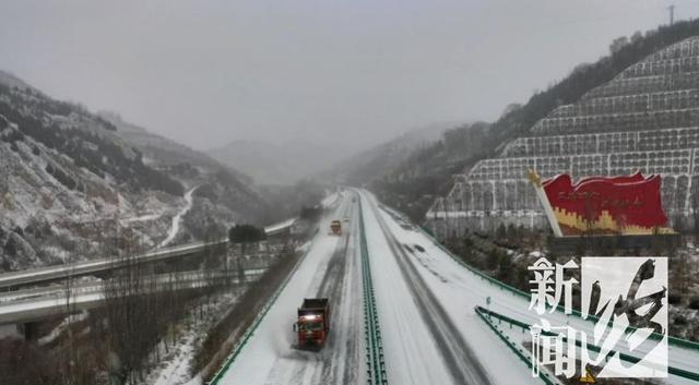 在贯穿秦岭的眉太高速宝川段田坝纽立交,这里的积雪厚度超五厘米,即使是铲雪车也只能艰难地行进。