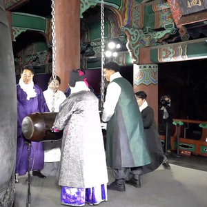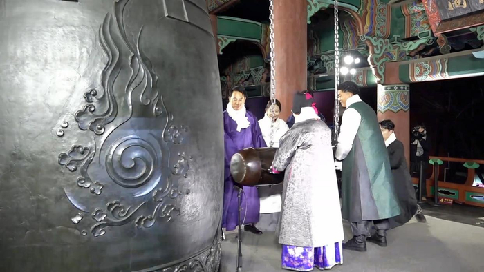 约3万名市民聚集在首尔市中心的钟路区普信阁一带,观看传统敲钟仪式,在33响清澈钟声中迎来新年。