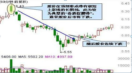 看跌捉腰带形态是一根长阴线,它的开市价位于单位K线的最高点(或者这根蜡烛线只有极短的上影线),然后市场一路下跌。在市场处于高价区的条件下,看跌捉腰带形态的出现,构成了顶部反转信号。捉腰带实体线的长度愈长,则该形态的技术意义越重大。