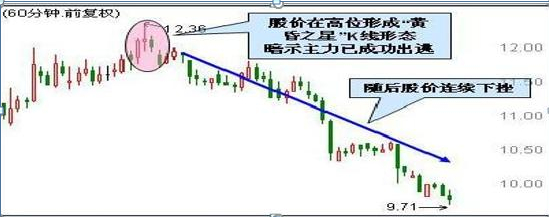 个股加速上涨运行至高位,突然在某个60分钟内加速上攻形成一根长阳线;随后在下一个60分钟内多空力量达到短暂平衡,形成高位十字星;接着大量获利盘兑现,导致股价快速下跌,形成一根阴线。这三根K线组合形态称之为“黄昏十字星”,通常预示着股价即将下跌。