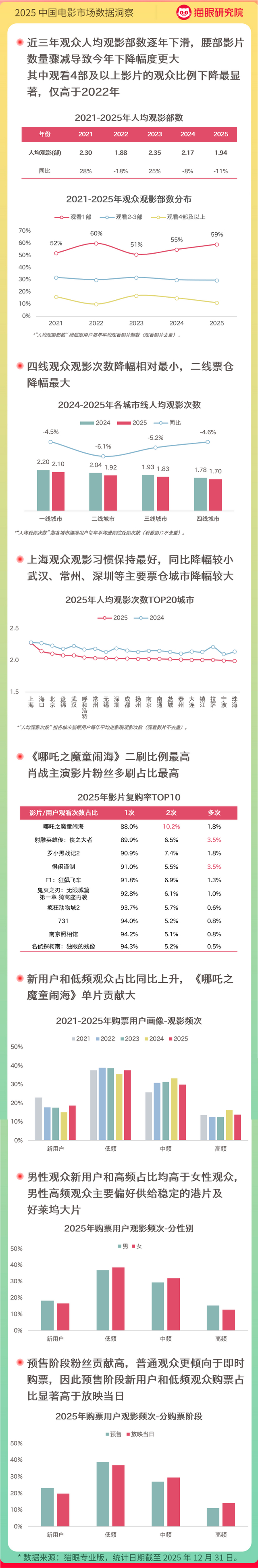 “根据我们观察到的情况,2025年看一次或者两次电影的观众比较多。如果是只看一次的,那大概率是去看的《哪吒2》。如果看了两次,那有可能是年初和年末各一次,分别是《哪吒2》和《疯狂动物城2》。”上述人士说。