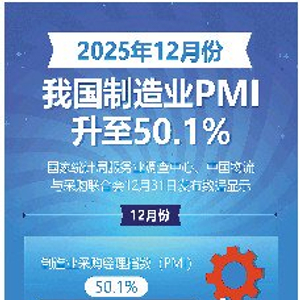 国家统计局服务业调查中心和中国物流与采购联合会发布数据显示,2025年12月份,制造业采购经理指数(PMI)、非制造业商务活动指数和综合PMI产出指数分别为50.1%、50.2%和50.7%,比上月上升0.9个、0.7个和1.0个百分点,三大指数均升至扩张区间,我国经济景气水平总体回升。