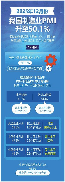 数据显示,2025年12月份,制造业PMI为50.1%,4月份以来首次升至扩张区间。在调查的21个行业中有16个行业PMI较上月回升,相关企业生产经营情况有所改善。