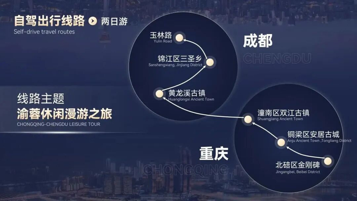 线路:重庆市两江新区江滩公园—重庆市九龙坡区涂鸦一条街—重庆市北碚区缙云山—重庆市合川区钓鱼城—重庆市沙坪坝区渣滓洞白公馆—重庆市沙坪坝区融汇温泉—重庆市大足区大足石刻—资阳市安岳石刻—成都市东部新区三岔湖景区—成都市锦江区cosmo—成都市青羊区宽窄巷子—成都市武侯区抚琴夜市—成都市天府新区兴隆湖湿地公园—成都市天府新区麓湖CPI—成都市双流区彭镇老街—成都市西岭雪山景区—成都市青城山景区—成都市都江堰景区