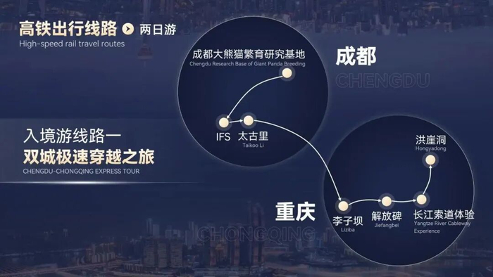 线路:成都市成华区成都大熊猫繁育研究基地—成都市锦江区IFS—成都市锦江区太古里—重庆市渝中区李子坝—重庆市渝中区解放碑—重庆市渝中区长江索道体验—重庆市渝中区洪崖洞