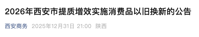 根据国家和陕西省消费品以旧换新工作部署,现就2026年西安市提质增效实施消费品以旧换新相关工作公告如下: