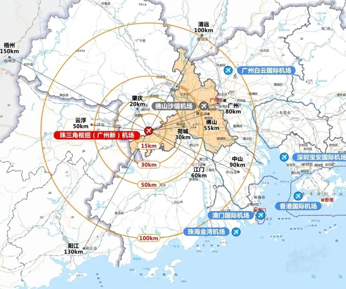 珠三角枢纽(广州新)机场选址佛山高明,本期设计目标年为2035年,本期工程总体按满足年旅客吞吐量3000万人次、货邮吞吐量50万吨、飞机起降量2万架次建设,最快本月就开建。