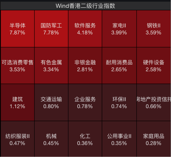 从行业来看,各类行业全线飘红,半导体、国防军工、软件服务、家电领涨。