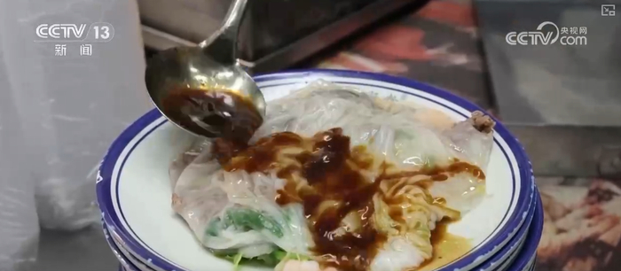 肠粉的做法并不复杂,在蒸盘上均匀浇上一层米浆,加入肉类、青菜等配料,大火蒸制1分钟后迅速取出。薄而透亮的米皮包裹着肉、鸡蛋、青菜等馅料,再淋上特制卤水,一份色、香、味俱全的肠粉就制作好了。