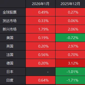 Wind数据显示,1月迄今,全球股票市场(以各自开市的交易日统计)总体上涨了0.49%。