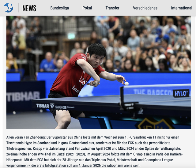 德国乒协官方网站称,樊振东代表着萨尔布吕肯俱乐部夺冠的终极希望(官网截屏)