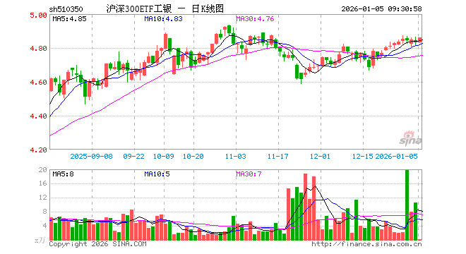 1月5日,沪深300ETF工银(510350)开盘跌0.02%,报4.831元。沪深300ETF工银(510350)重仓股方面,宁德时代开盘涨0.75%,贵州茅台涨0.57%,中国平安涨1.17%,招商银行涨0.90%,紫金矿业涨2.41%,新易盛涨1.42%,中际旭创涨1.82%,美的集团涨2.42%,东方财富涨0.17%,长江电力涨0.04%。